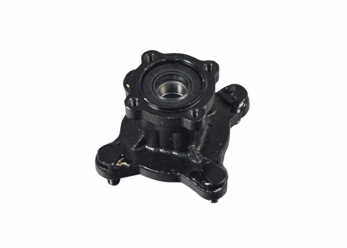 This cast and machined hunk of metal uses four M8-1.25 threaded studs for the front rims and four M6-1.0 bolt holes where the brake disc is mounted.